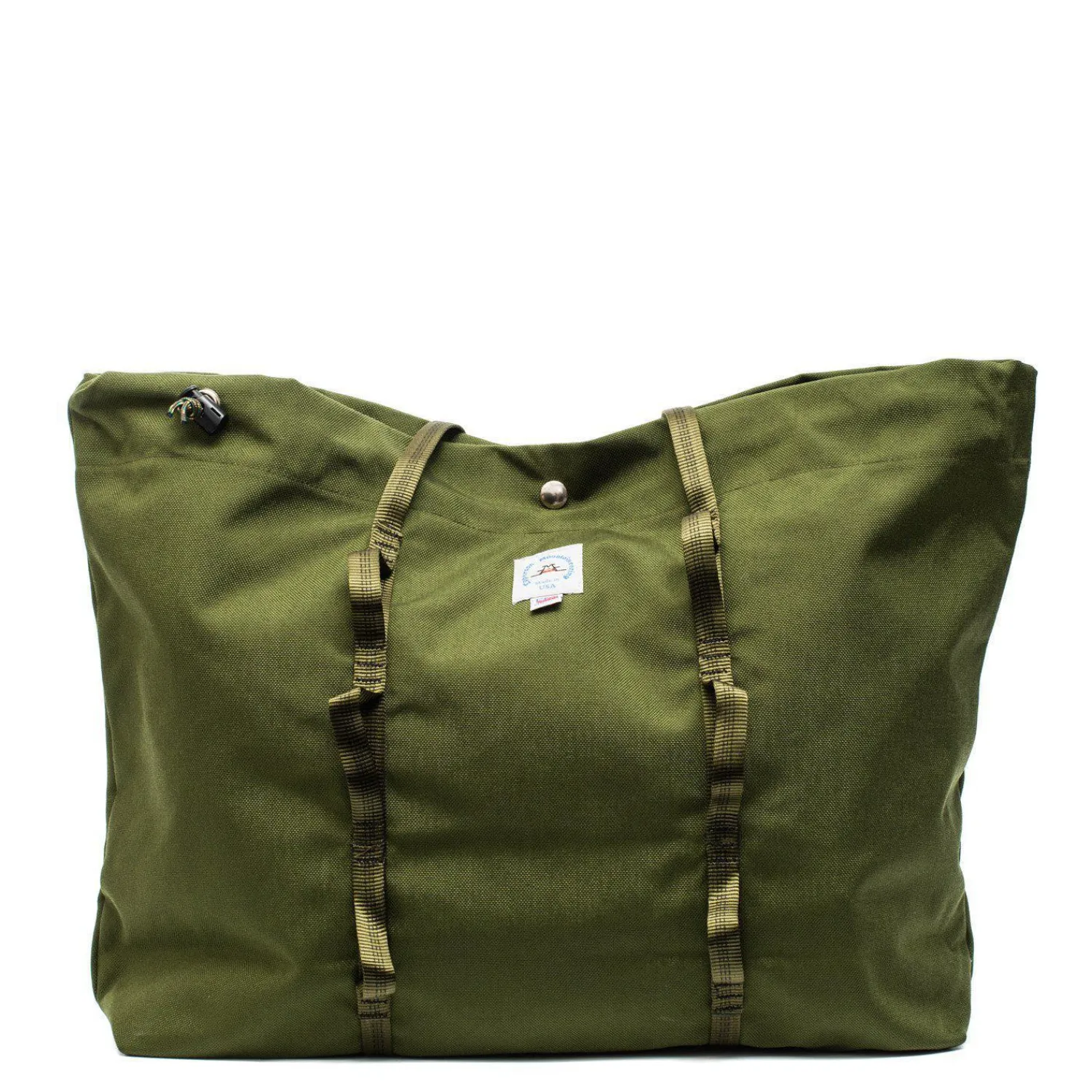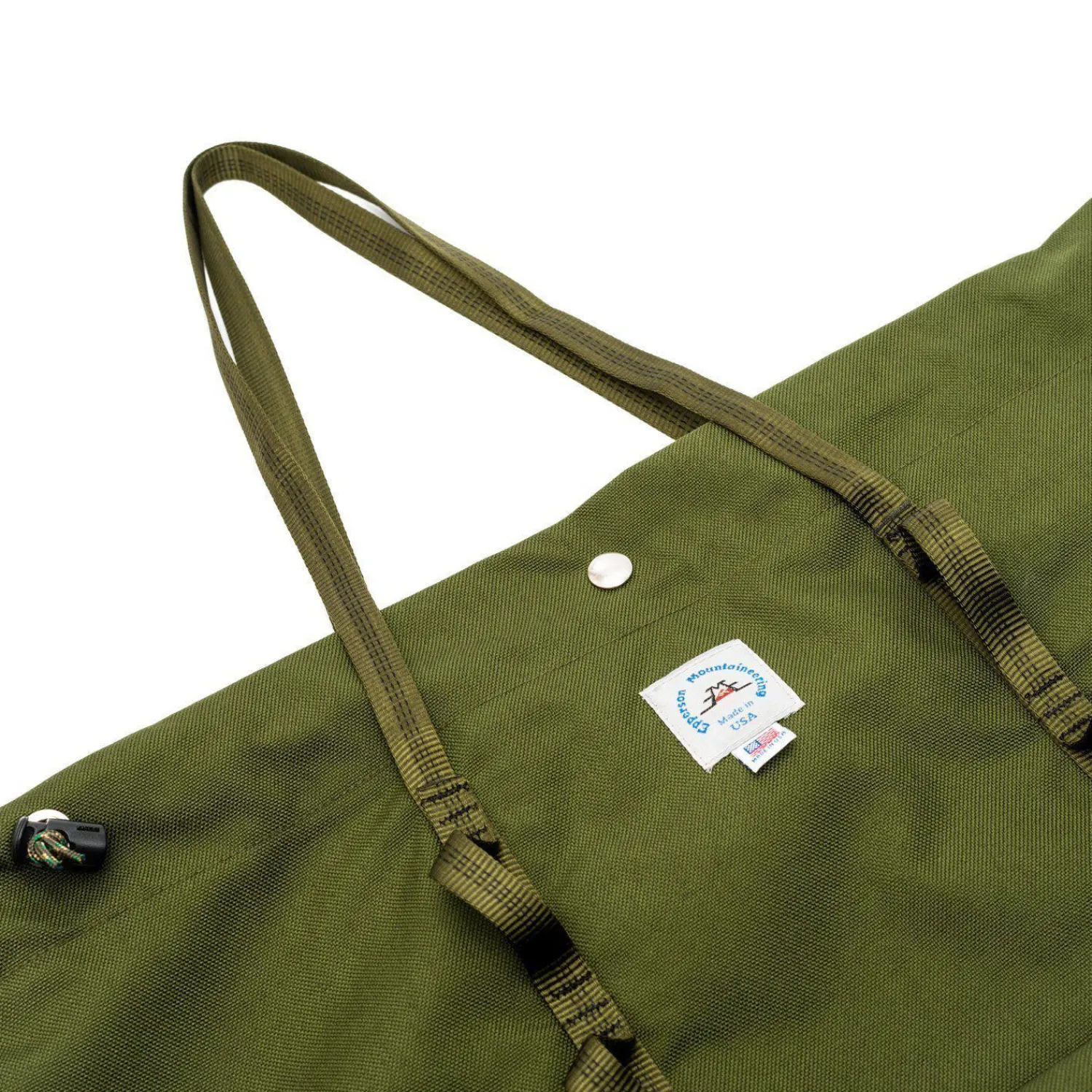 Epperson’s Large Climb Tote combines the casual portability of a classic tote bag with the ruggedness of durable rock climbing gear. Water-resistant Cordura nylon fabric combined with mil-spec tubular nylon webbing make it rugged and durable while snap button closure and climbing-spec daisy chain webbing (a chain of small loops reinforced with bar-tacks) along the face of the bag increase utility and provide the iconic climbing aesthetic.