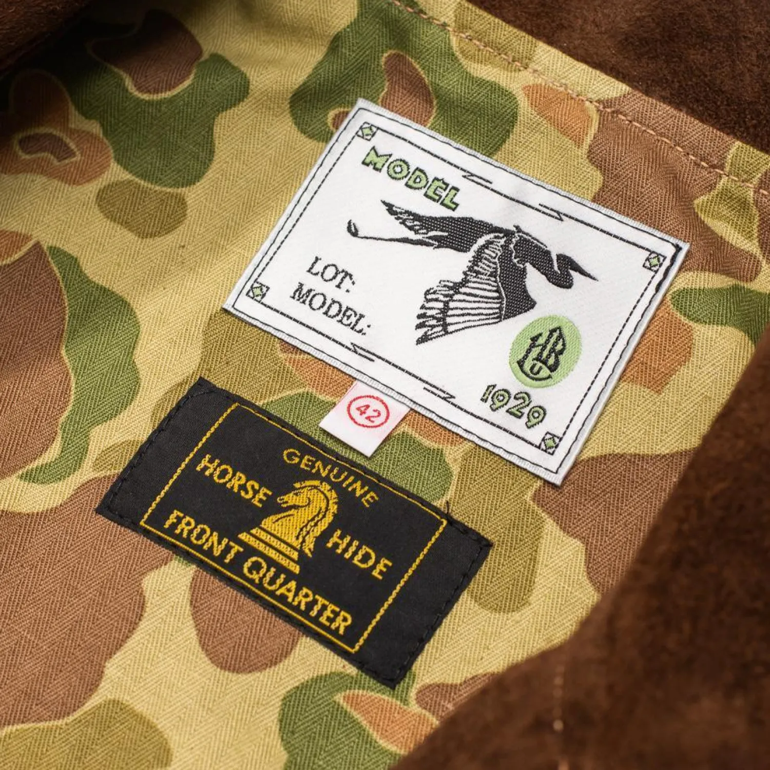 The jacket has been lined with a heavyweight Vietnam-era tiger stripe camo exclusive to Himel, produced in Japan.