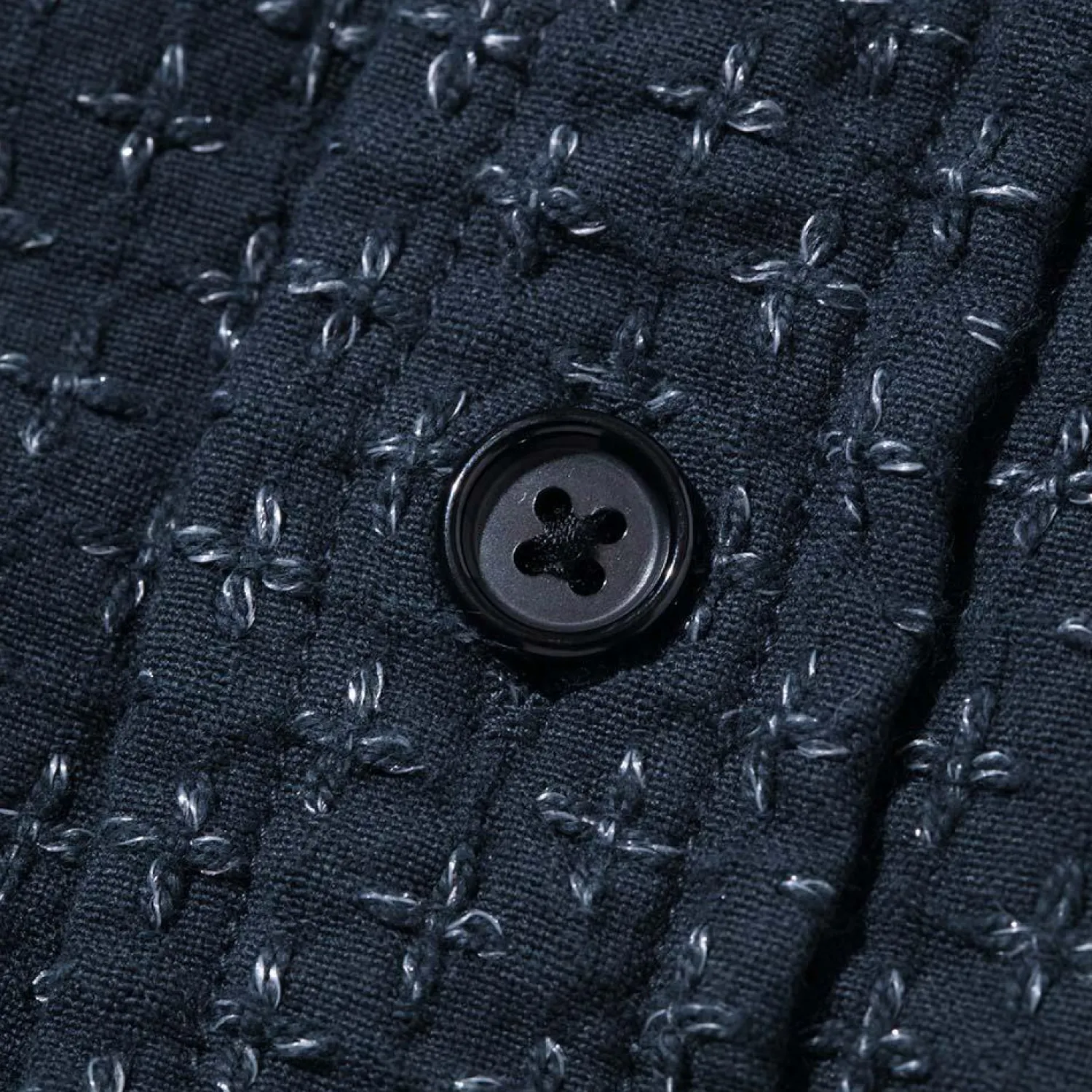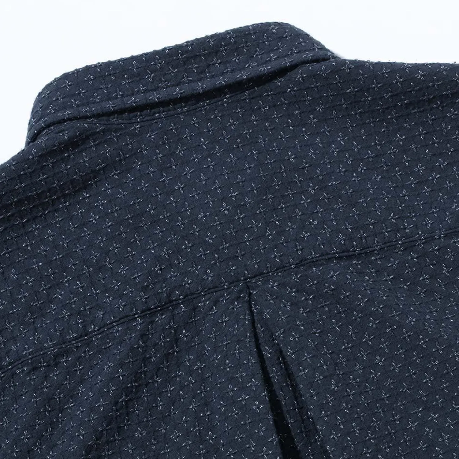 Here we have the Regular Collar Cross Sashiko Shirt, forming a key piece from Kuon’s SS22 collection. Cross Sashiko is a high-density double-woven Sashiko-ori fabric with 2-ply 40 count yarn in the warp and 20 count single yarn in the weft. Although difficult to machine weave, Kuon have made this possible by altering the speed and slowing the machinery down to almost hand sewing pace, resulting in a fabric that is light in weight. The use of thicker Sashiko threads makes the fabric taut and provides the shirt with a three-dimensional surface.