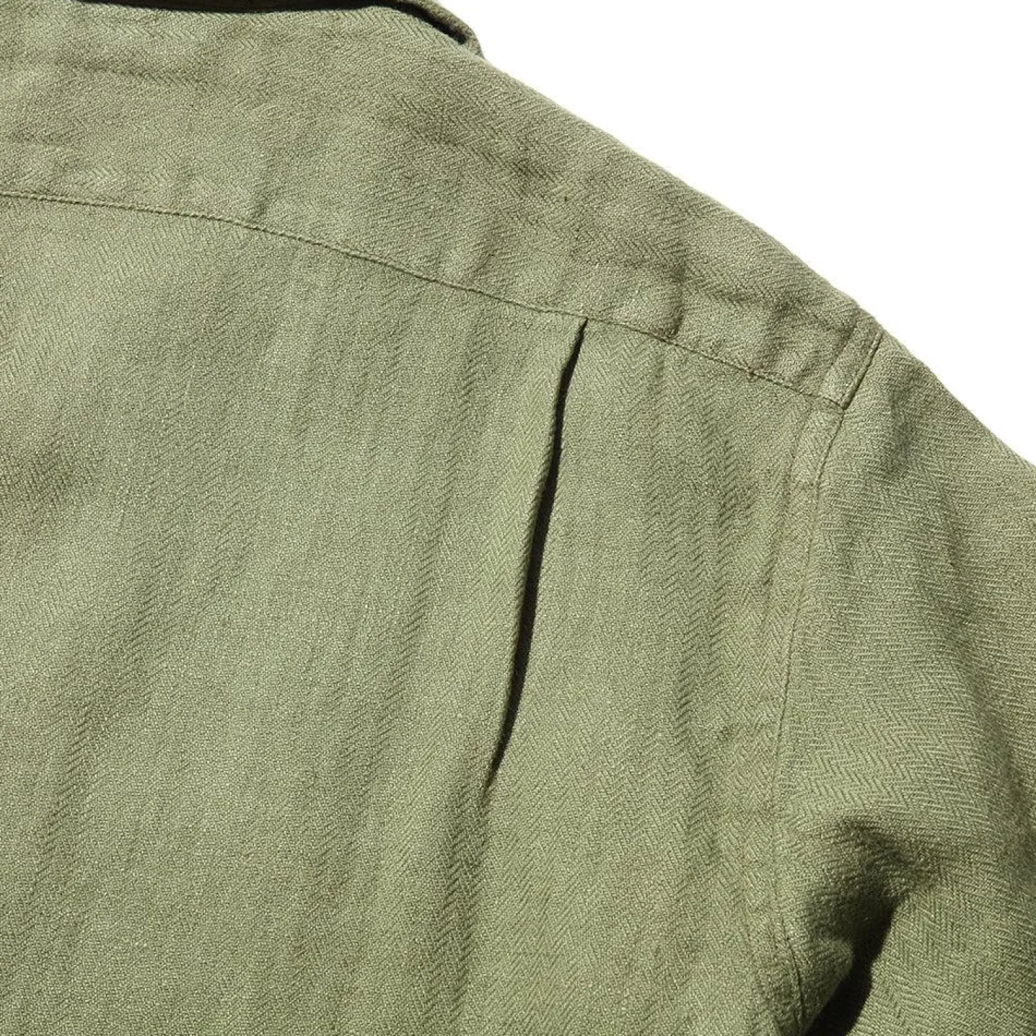 Cut in Japan from 100% linen herringbone that has been woven on vintage machinery at an extremely slow pace on vintage machinery giving the fabric a low tension, almost hand woven touch. A button front has been paired with a single chest pocket while the classic 50’s style open collar completes the look.