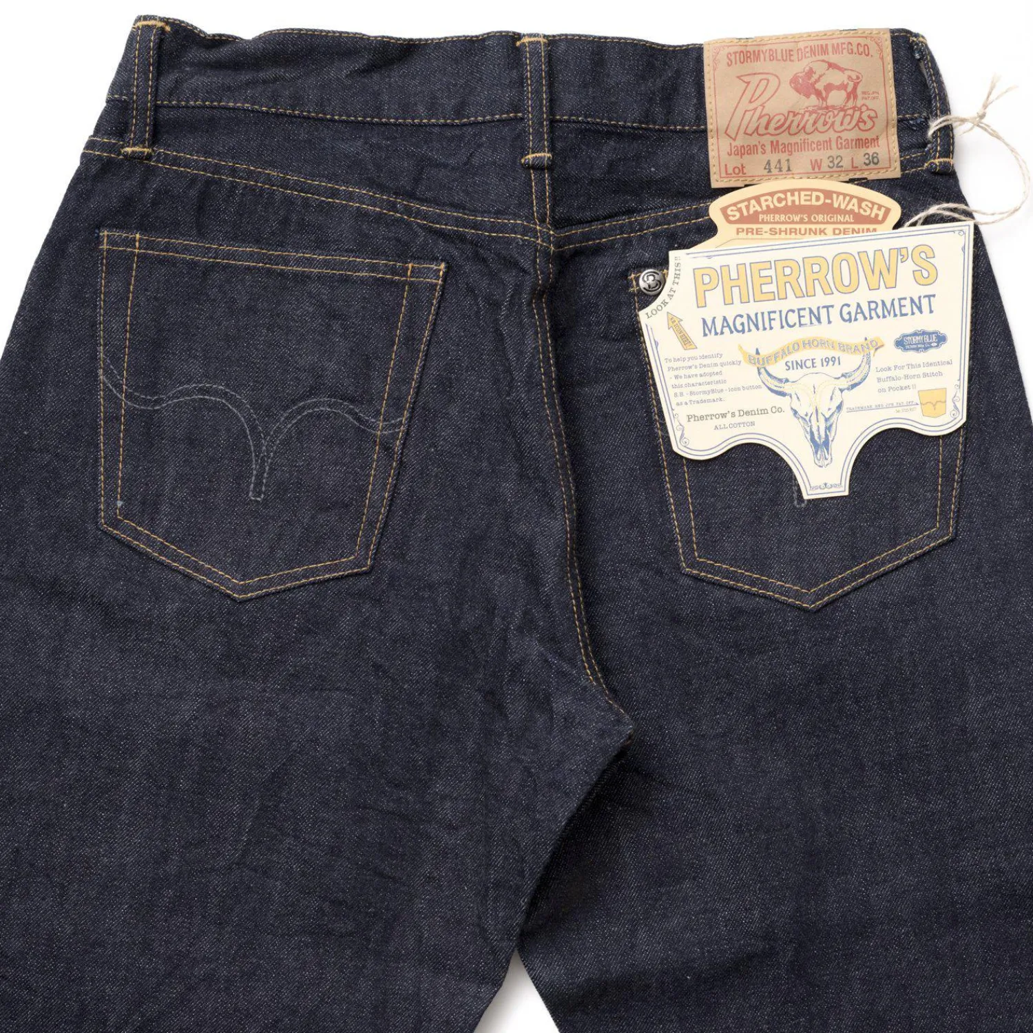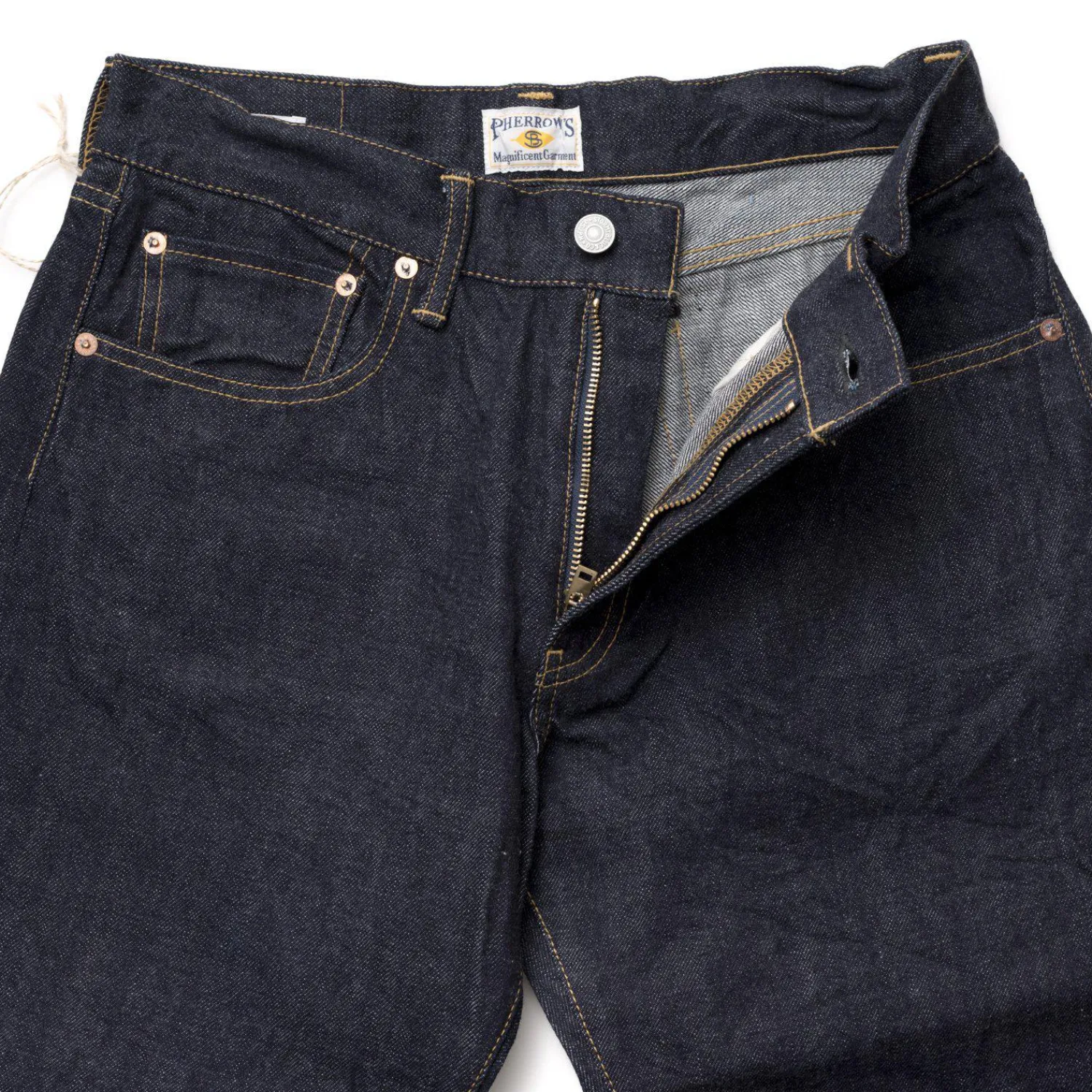 Made with Pherrow’s 13.5oz yellow listed selvedge denim, they have been put through a one wash treatment to remove shrinkage, before a starching process is reapplied to make them feel and age like raw denim.