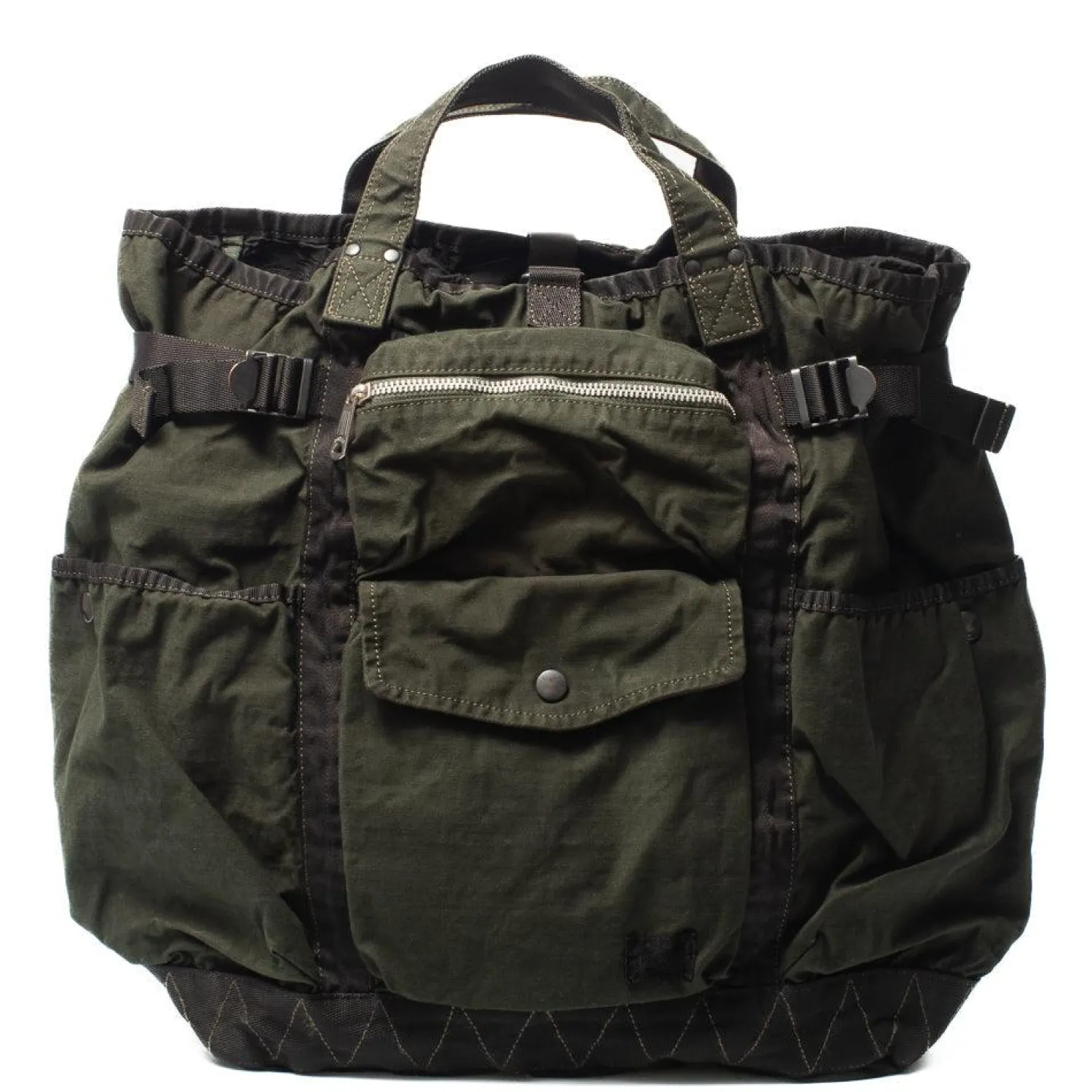 The Rucksack features nylon webbing throughout and features one interior compartment. There are multiple pockets on the front and side for excess carry and storage with zip and snap closure while it can be worn on the back or carried with the top handles.