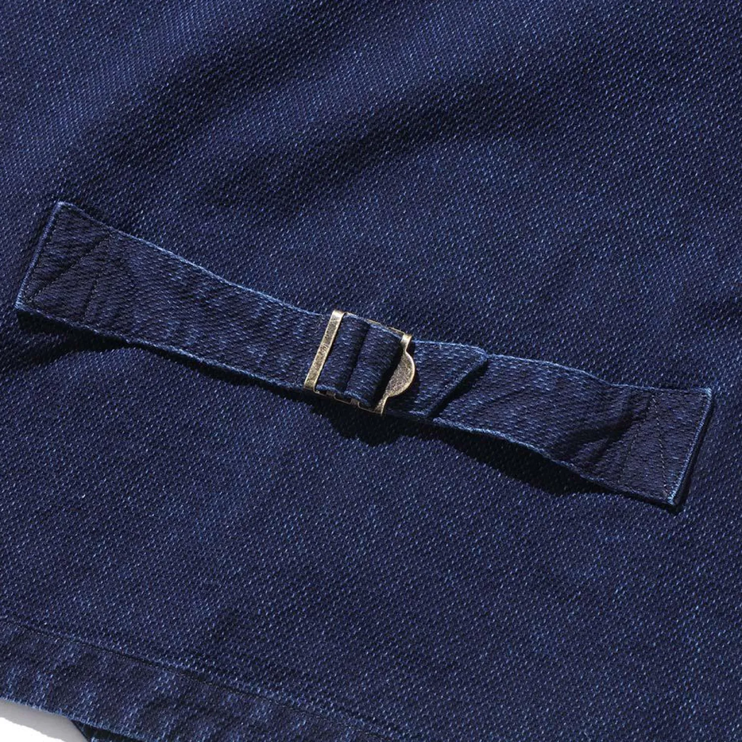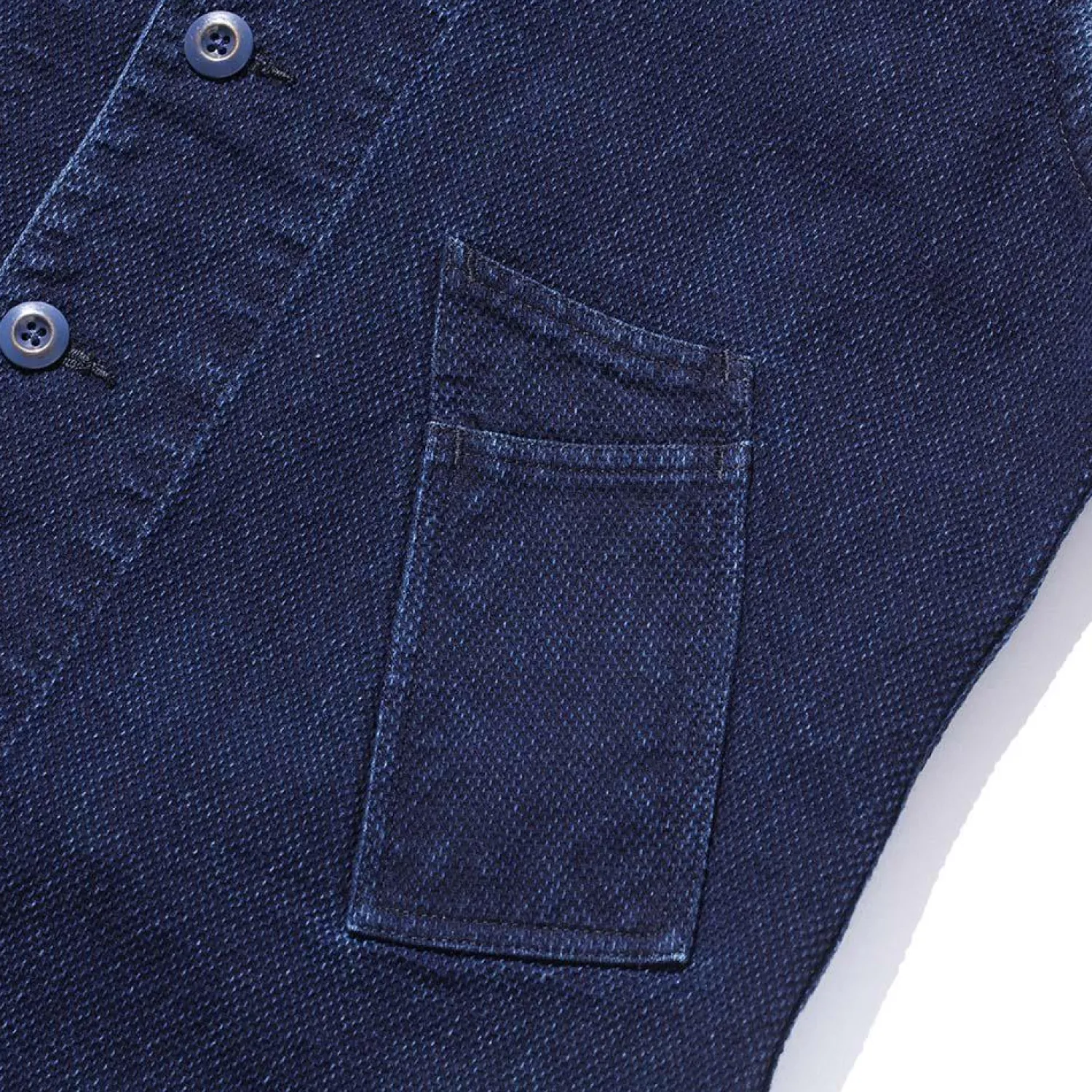 The Marcy features double slanted pockets with ample space to house pens, pencils or brushes as well as a single chest and lower pocket. Constructed from a washed indigo sashiko in Japan, the Marcy also features a button front and cinch on the back to adjust fit as necessary.