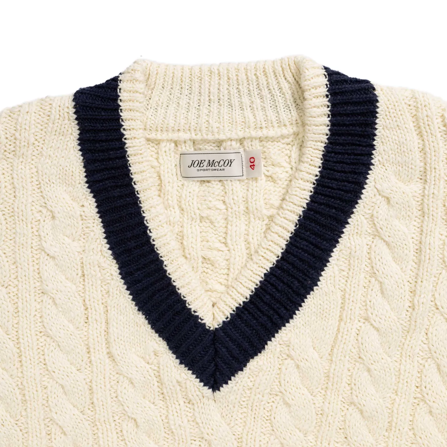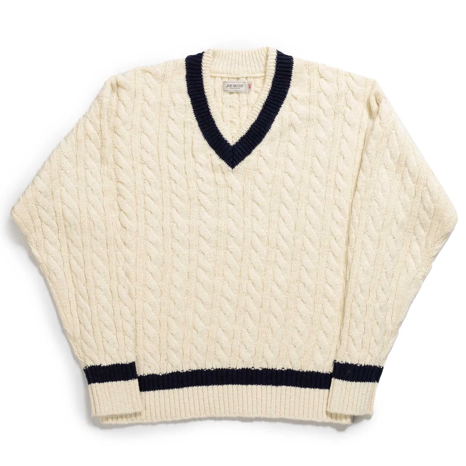 Made in Japan from a 5-gauge slub cotton, with cable knit construction throughout (introduced to make a sturdier knit) while contrasting stripes on the waist and collar would represent team colours, but in this case a nice point of difference. Ribbed hem & cuffs with woven McCoy sportswear label complete the look.