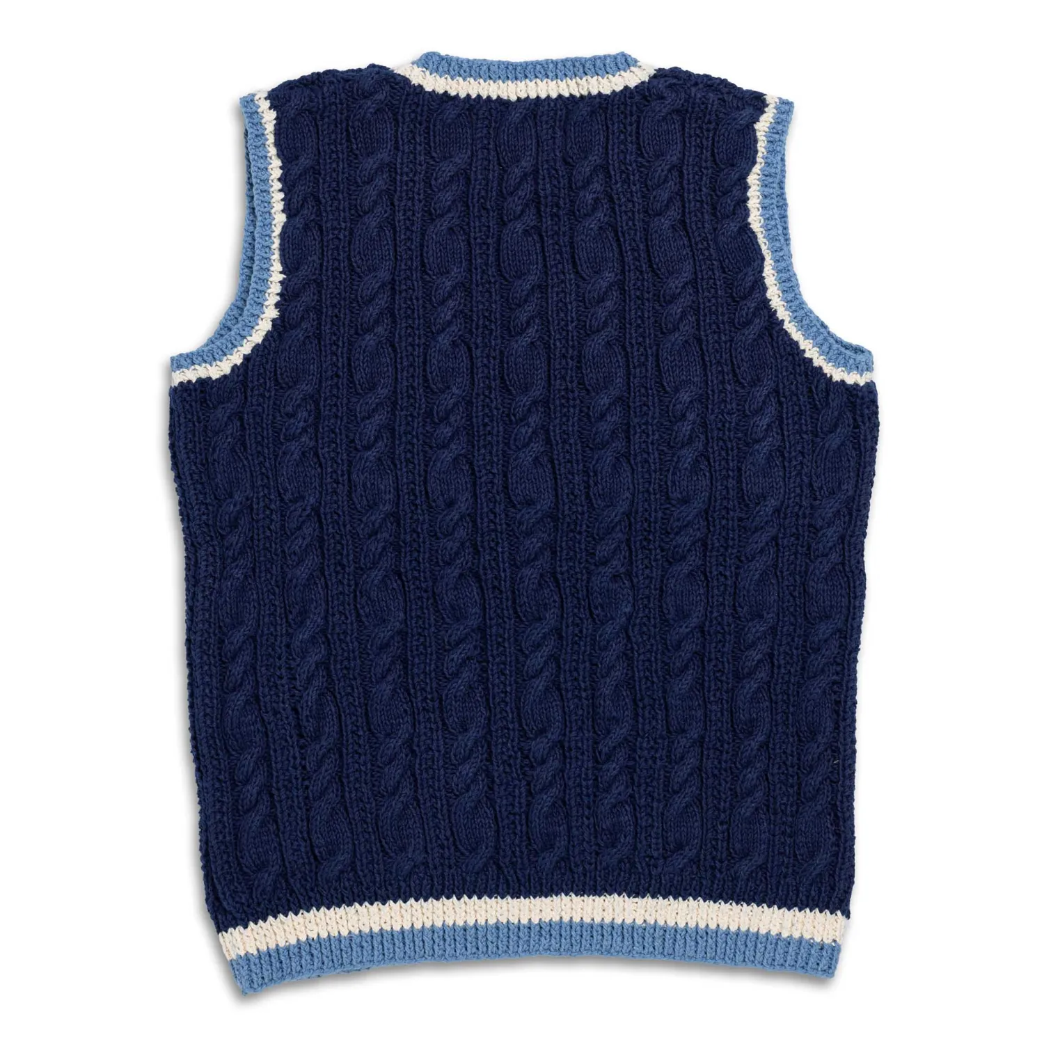A collaboration with Inverallan of Scotland & Allevol, the Cricket Slipover is inspired by vintage style British Cricket vests. The Cricket Slipover is defined by its cable-knit pattern, with distinctive v-neck & striped trim, traditionally representing school or club colours. Hand-knitted from 100% cotton in Scotland, the chunky knit yarns provide a sturdy handle to this classic piece of British inspired Sportswear.