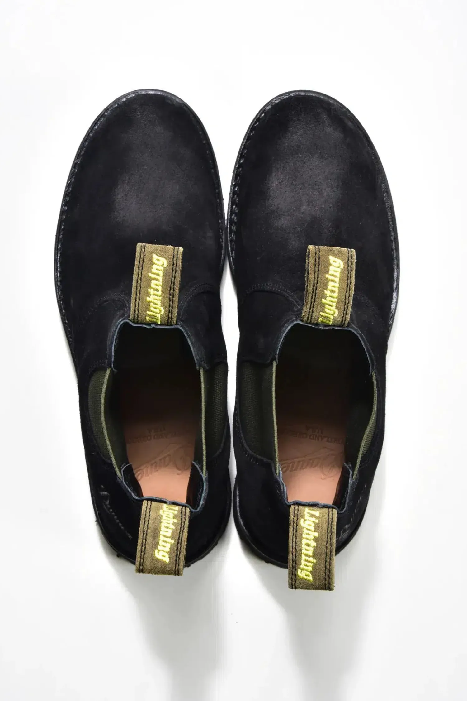 The finishing touches are to the boot include the ‘Danner‘ embossed outer heel, strong duo-colour side gussets with a black inner and olive khaki outer; which also match the double-sided green suede pull-on-straps with the ‘Lightning‘ logo embroidered on both sides.