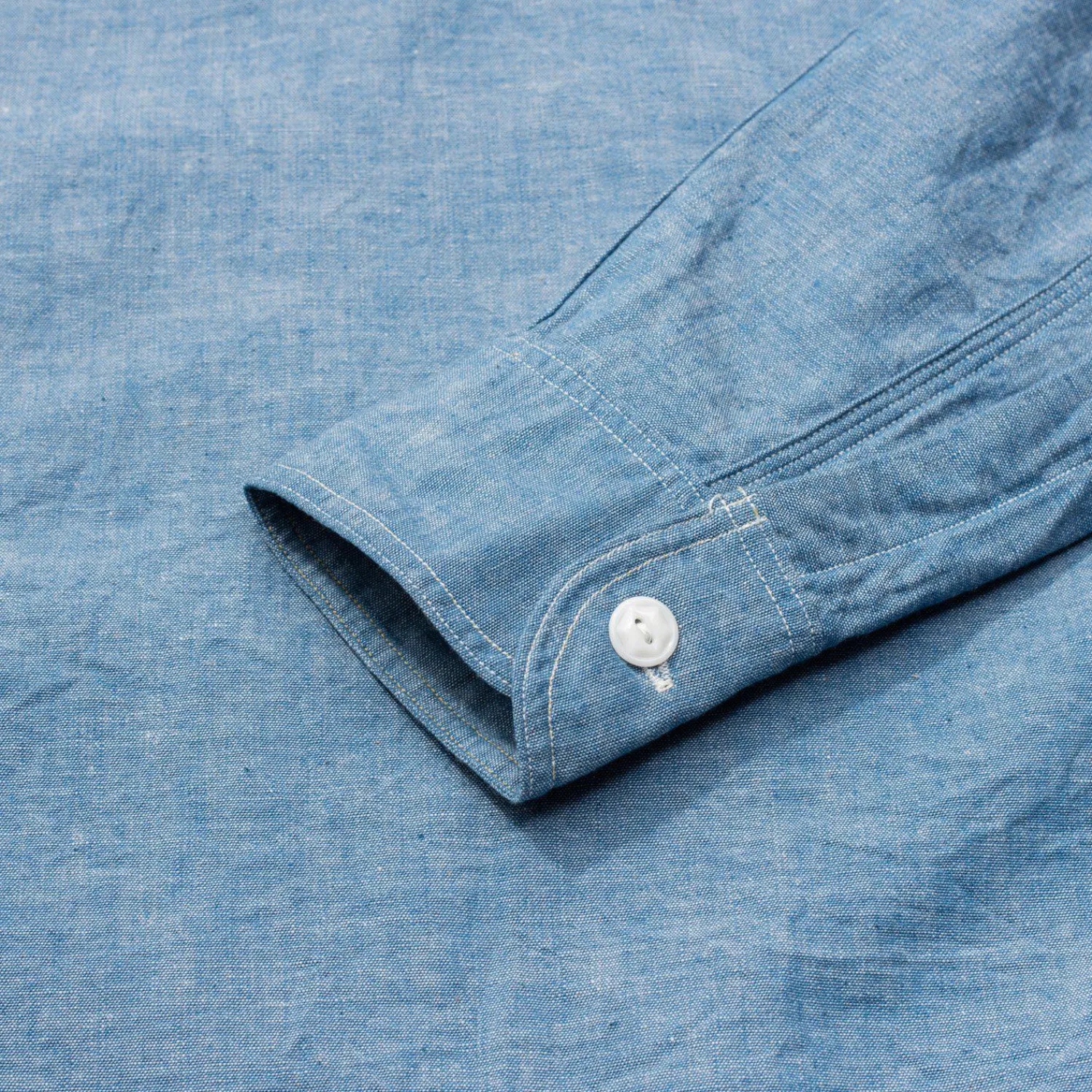 Cut in Japan from 100% cotton chambray, the Smoker Shirt is based on a vintage Big Yank ‘Gatchapoke’ work-shirt of the 1920’s. The name comes from the asymmetrical pocket shapes, originally designed to house cigarettes. A button front with contrasting white buttons and triple stitched detailing throughout completes the look. This particular model is based on a vintage ‘Braveman’ style from the brands archives.