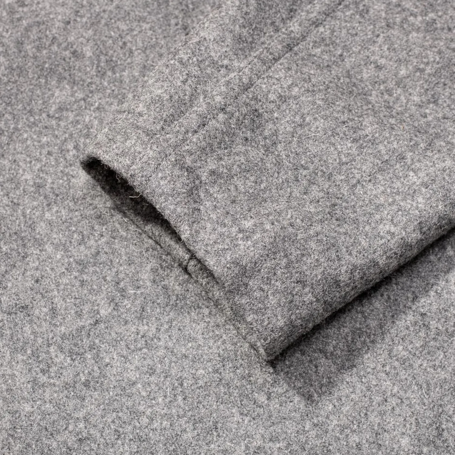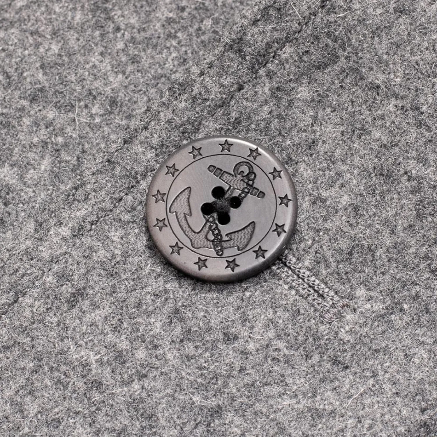 - John Gluckow has left the pattern unchanged but produces the coat in a marl charcoal grey melton wool instead of the standard black or deep navy blue. The button-front boasts the recognisable 13-star fouled anchor buttons design in ivory corozo nut, and two buttoned flapped hip pockets. The angular collar lays flat against the body and fastens up into a funnel around the neck.