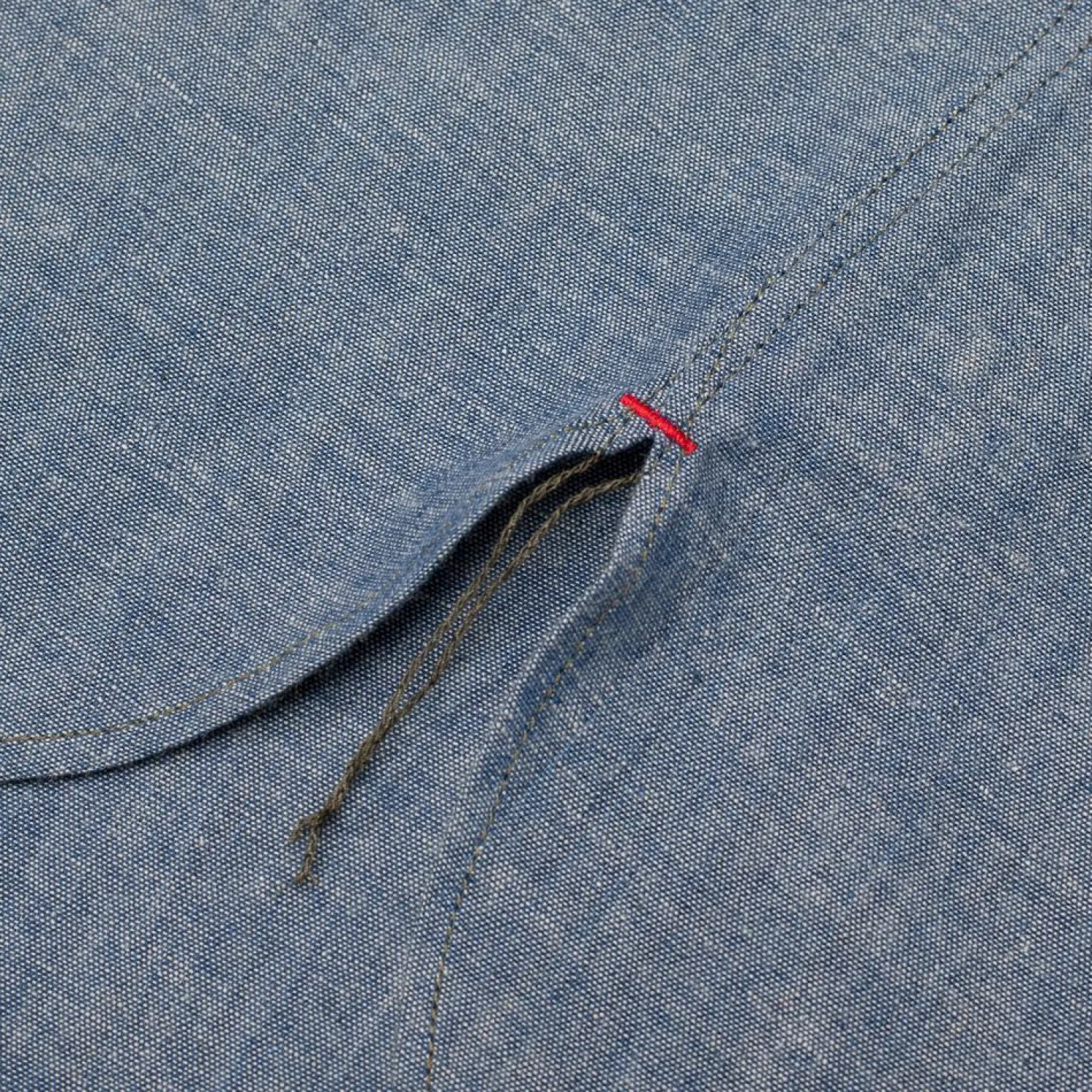 Characteristics from original garments issued included a one-piece unstructured collar (no collar band), a singular style of elbow reinforcement patch, and two large utilitarian chest pockets each with pen compartments. The Snipes features all of these details but has been cut from a slubby indigo chambray fabric with green contrasting stitching.