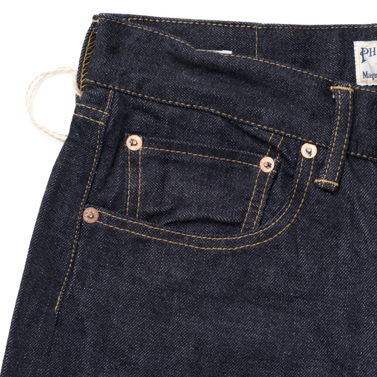 Made with Pherrow’s 13.5oz yellow listed selvedge denim, they have been put through a one wash treatment to remove shrinkage, before a starching process is reapplied to make them feel and age like raw denim.