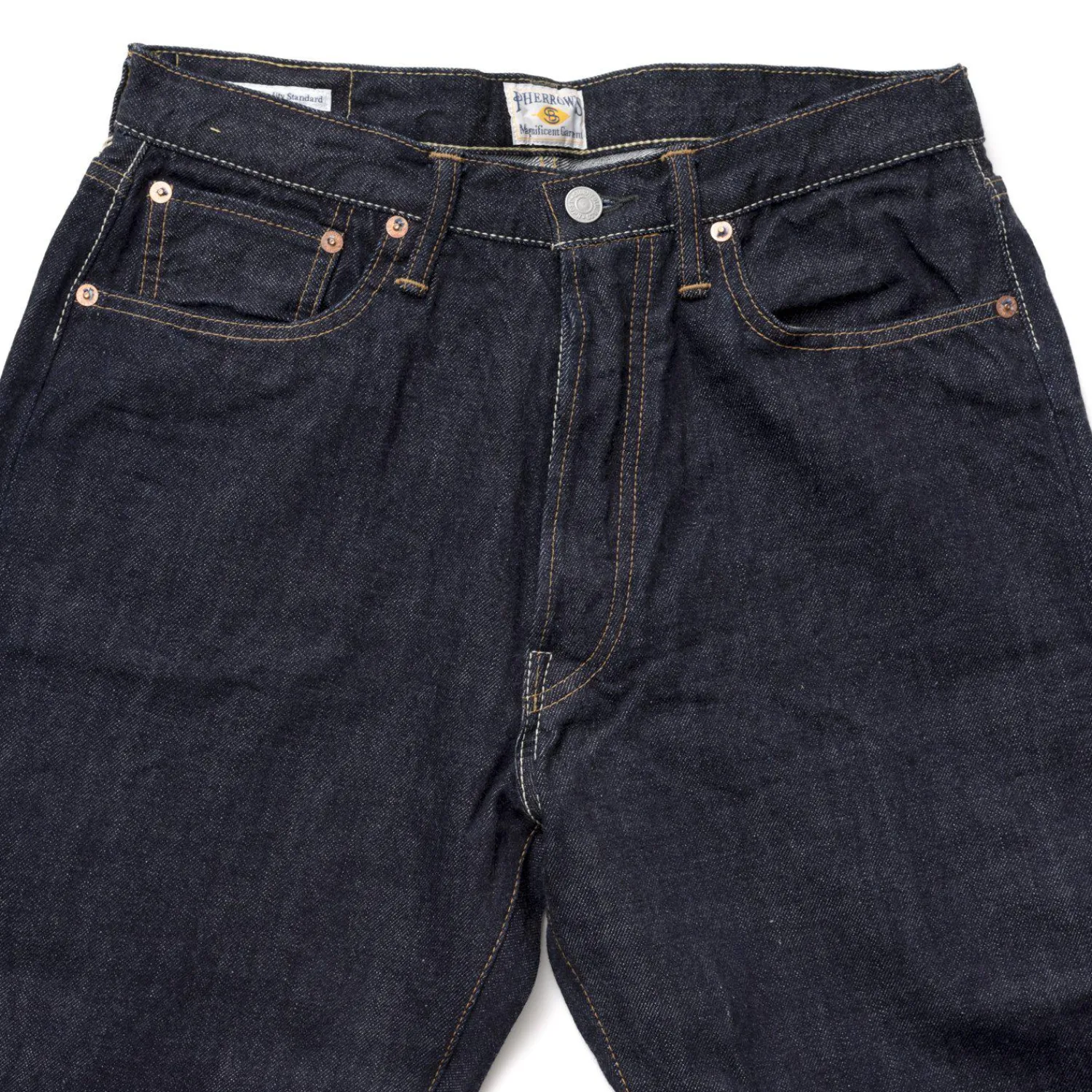 Made in Pherrow’s 13.5oz yellow listed selvedge denim, they have been put through a one wash treatment to remove shrinkage, before a starching process is reapplied to make them feel and age like raw denim.
