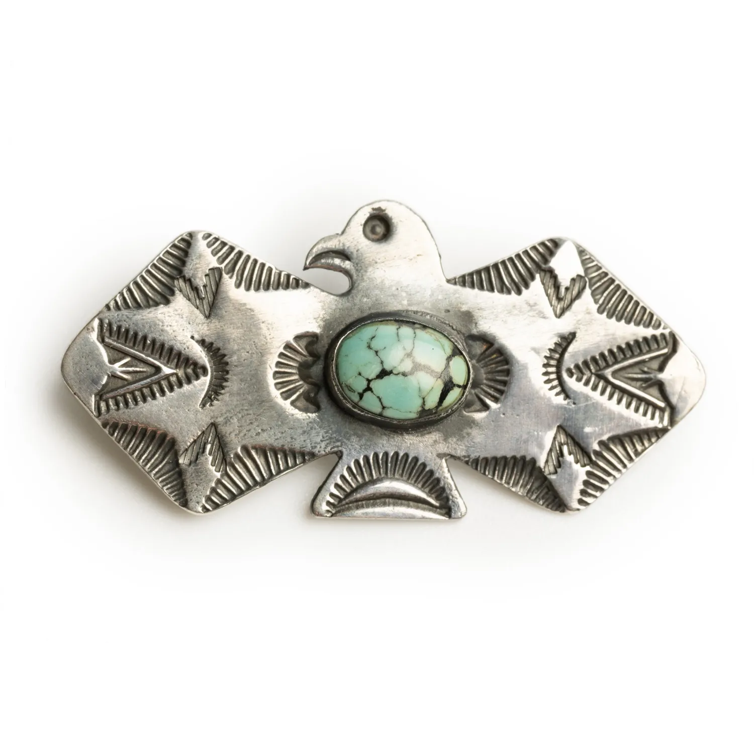 Dress up your favourite jacket with one of these lil’ thunderbirds. Approximately 1 3/4 inches long and 1 inch tall, with a round turquoise stone. Each stone varies.