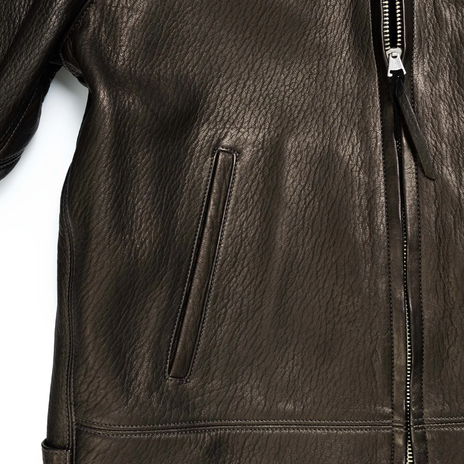 The Freeman features a pleated rear design with pressed iron cinch buckles. A zip front using a 1930’s pin-lock zipper has been paired with a single chest pocket with a ball-chain zipper as well as two lower slash pockets. The cuffs feature a wool-ribbing as well as period correct urea buttons, while the lining is a cotton/satin mix, complimenting the deerskin leather.