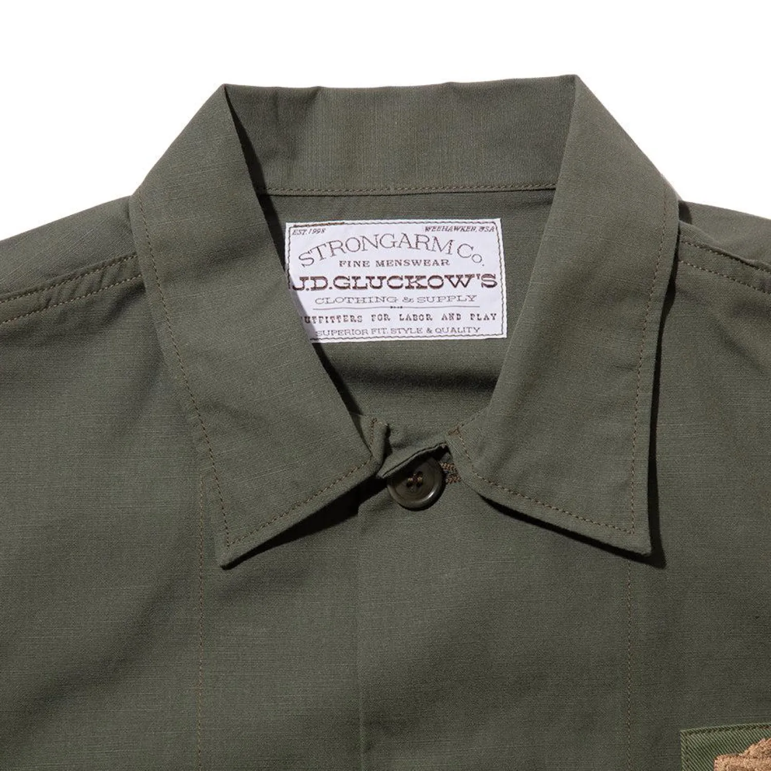 This example from the John Gluckow collection by Warehouse & Co is a fine example of this style of shirt. Cut in Japan from a sulphur dyed, selvedge cotton poplin, the JG-07 Shirt features two chest pockets with button closure as well as a button front. All buttons used are original tonal nut buttons, while the shirt is adorned with patches, similar to those that adorned John Lennon’s OG-107 Poplin Shirt.